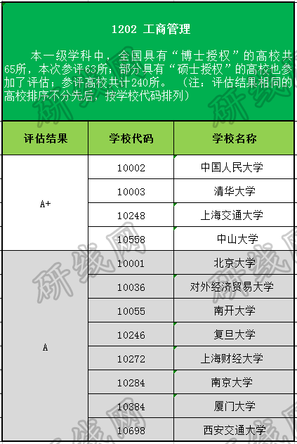 教育部學位與研究生教育發展中心于2017年12月28日公布全國第四輪學科評估結果,其中管理學類學科高校評估結果為A及A以上等級的學校名稱及代碼如下: