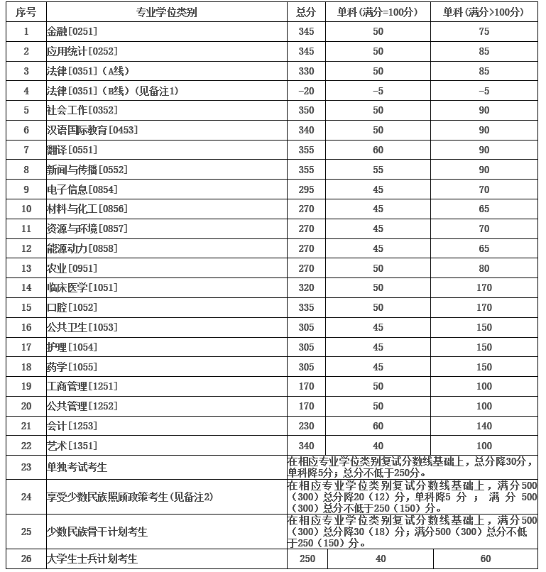 備注:1.B線適用范圍:第一志愿報考我校法律(法學)、法律(非法學)專業,且本科畢業4年(同等學力考生畢業6年)及以上(畢業信息以網報信息為準)的考生。滿足B線要求的考生須向報考學院書面申請并經報考學院審核同意后方可參加復試。2.享受少數民族照顧政策的考生是指:報考我校、申請定向國務院公布的民族自治地方就業且戶籍在以上地區的少數民族考生。?
