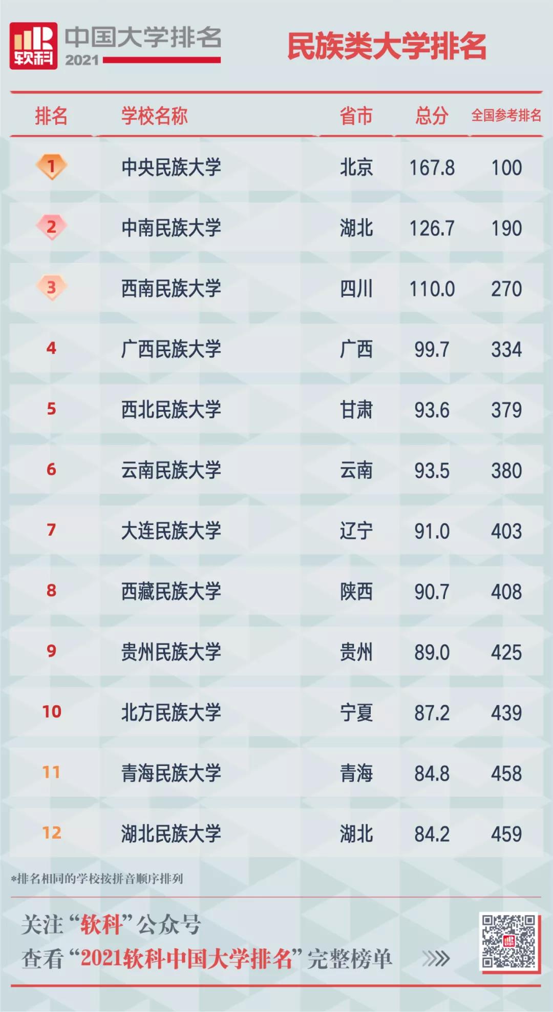 2021軟科中國民族類大學排名的上榜高校有12所,中央民族大學、中南民族大學、西南民族大學位列前三。