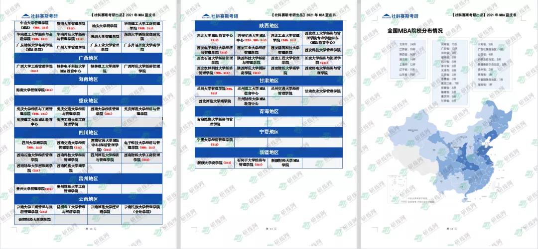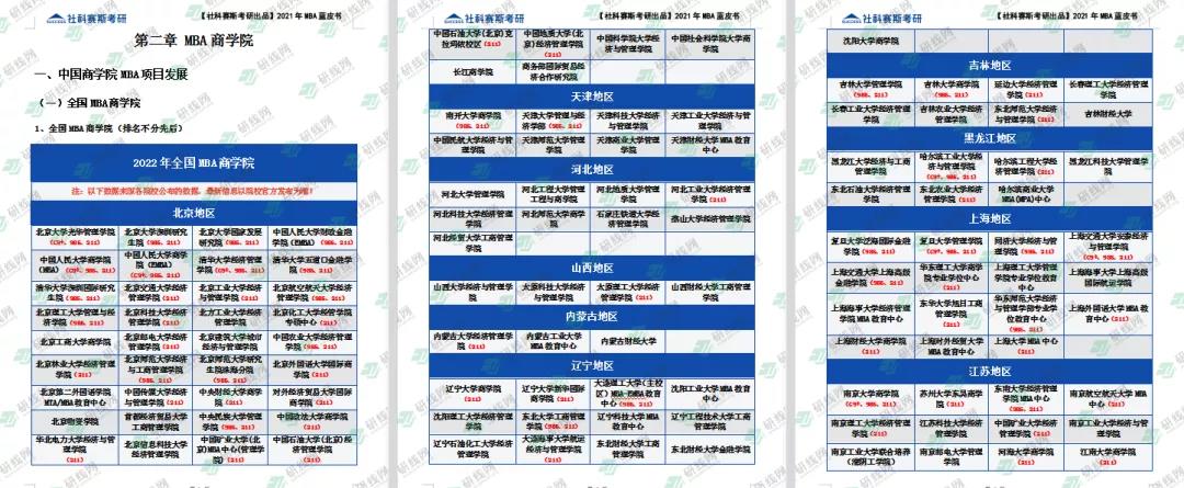 MBA初試內(nèi)容、科目與形式在藍(lán)皮書(shū)當(dāng)中均有介紹,這里不過(guò)多贅述。在MBA招考情況這一部分,涵蓋2016-2021考研MBA項(xiàng)目國(guó)家線、34所自劃線院校招生細(xì)則,如院校性質(zhì)(952、211)、學(xué)習(xí)方式(全日制、非全日制)、所屬院系、研究方向、學(xué)費(fèi)、學(xué)制(2/3年),招生人數(shù),復(fù)試分?jǐn)?shù)線、復(fù)試形式等,還將全日制項(xiàng)目、以及非全日制項(xiàng)目學(xué)費(fèi)進(jìn)行統(tǒng)一排名,詳細(xì)全面,幫助考生們快速查詢(xún)。
