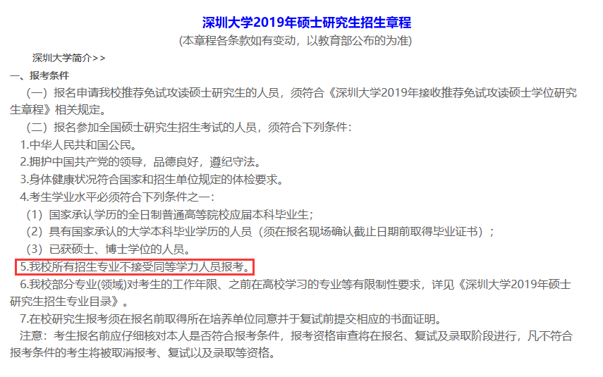 以同等學力身份報考需要注意,認真看招生單位的招生簡章關于同等學力的要求,有些學校不接受同等學力報考,比如深圳大學在招生簡章會明確說明:我校所有招生專業不接受同等學力人員報考。
