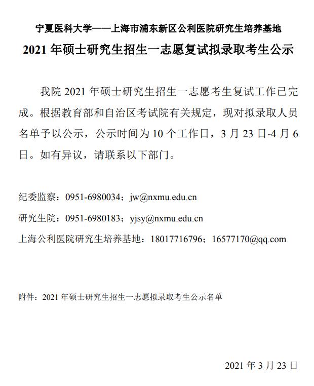 2021考研擬錄取名單:寧夏醫(yī)科大學(xué)上海市浦東新區(qū)公利醫(yī)院2021年碩招一志愿考生擬錄取名單公示”的全部內(nèi)容,更多錄取名單相關(guān)內(nèi)容點擊