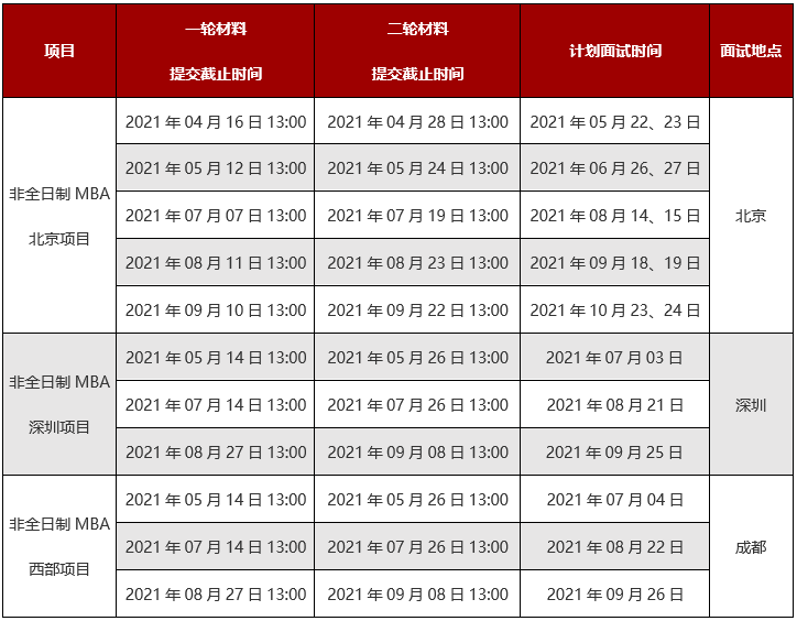 2022年非全日制MBA北京項目的一輪材料提交最終截止時間為2021年09月10日13:00,二輪材料提交最終截止時間為2021年09月22日13:00;2022年非全日制MBA深圳、西部項目的一輪材料提交最終截止時間為2021年08月27日13:00,二輪材料提交最終截止時間為2021年09月08日13:00。申請人必須在此之前在線填寫材料,檢查無誤后直接在線提交。