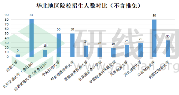 根據以上數據分析,如圖所示,華北地區招生人數(全日制+非全日制)TOP3分別為:北京交通大學96人、山西財經大學80人、對外經濟貿易大學50人、中央財經大學50人。