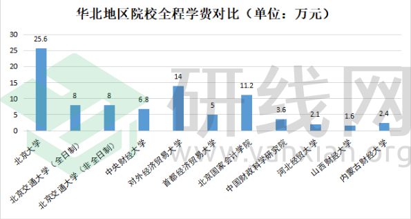 根據以上數據分析,如圖所示,華北地區學費TOP3分別為:北京大學25.6萬、對外經濟貿易大學14萬、北京國家會計學院11.2萬。天津財經大學2021年學制2年,學費官方暫未公布。