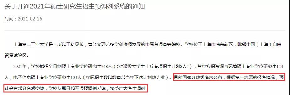 上海第二工業大學發布了《關于開通2021年碩士研究生招生預調劑系統的通知》,明確自2月26日起,開通預調劑系統,接受廣大考生調劑。
