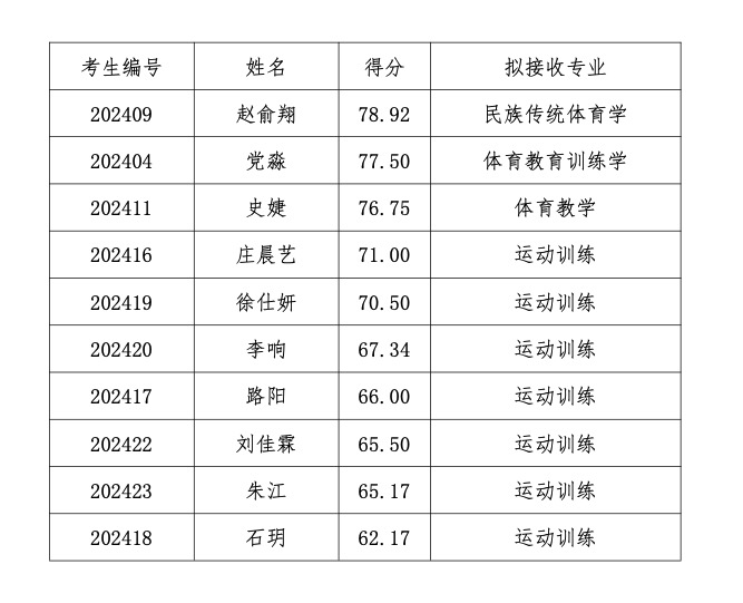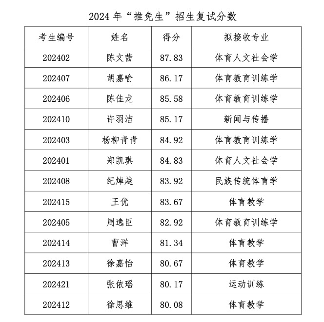 南京體育學(xué)院2024年擬接收“推免生”名單公示根據(jù)《南京體育學(xué)院2024年接收推薦免試攻讀研究生章程》的相關(guān)規(guī)定與工作安排,經(jīng)面試、英語測試、技能測試等環(huán)節(jié)考核,我校擬錄取以下同學(xué)免試攻讀碩士研究生,現(xiàn)將名單公示如下,公示期自即日起10個(gè)工作日,對名單如有異議者,請致電:025-84755173