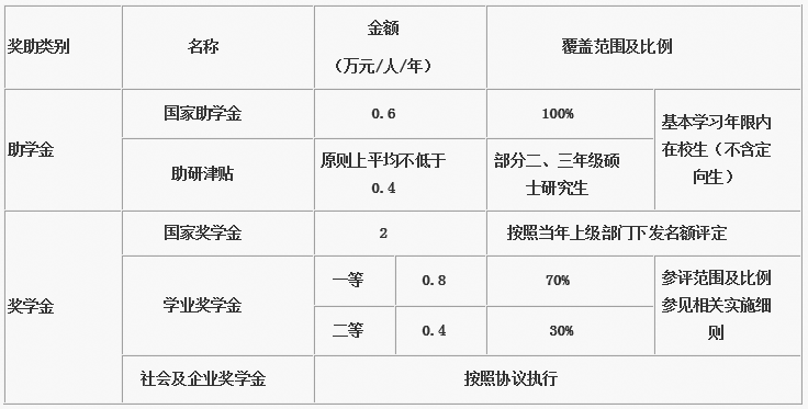 為激勵研究生勤奮學習、潛心科研,在全面實行研究生教育收費制度的情況下更好地支持研究生順利完成學業(yè),學校設立了研究生獎、助學金。2019年碩士研究生獎、助學金見下表(僅供參考):