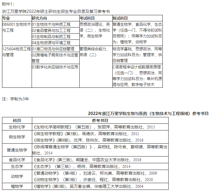 附件1:浙江萬里學院2022年碩士研究生招生專業目錄及復習參考書