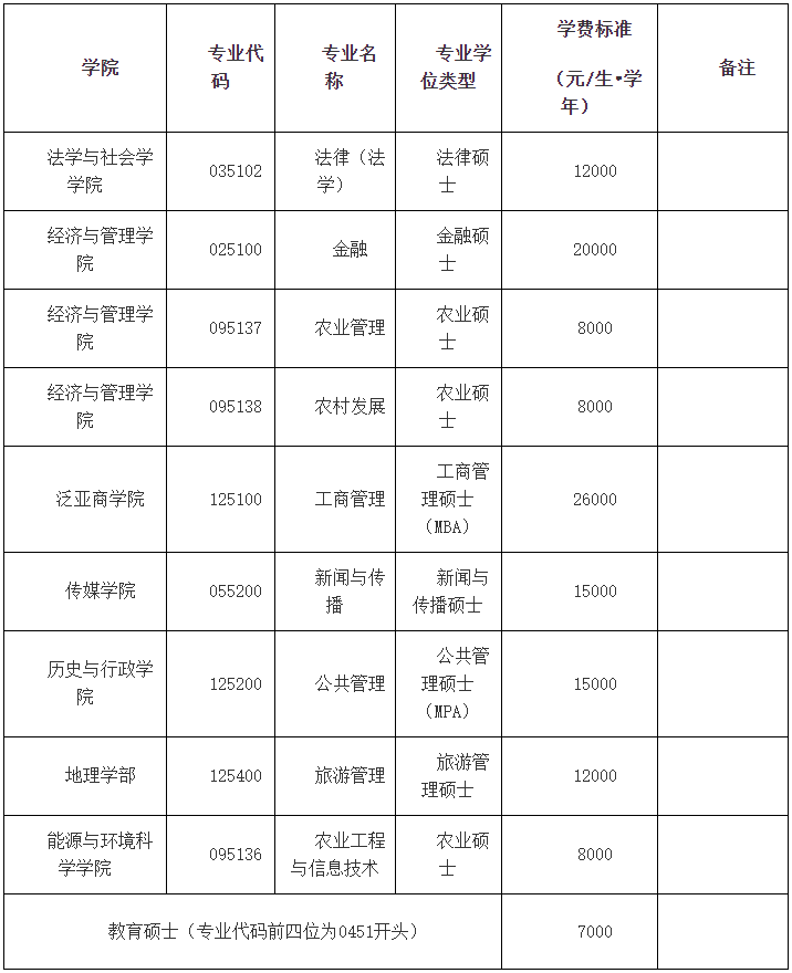 | 法學與社會學學院 | 35101 | 法律(非法學) | 法律碩士 | 12000 |