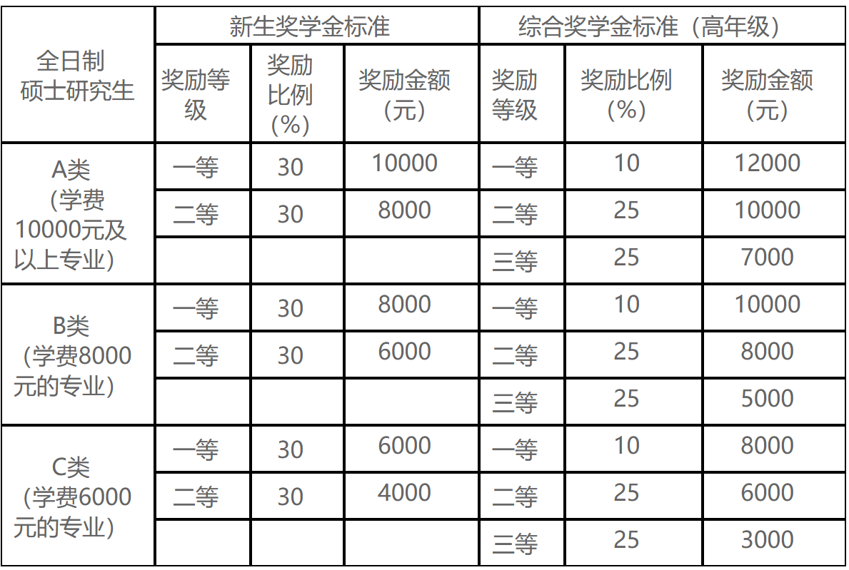學校以“獎勵優良學生,提高教育質量,補助基本生活,提高整體待遇,優化結構機制,促進科學發展”為目的,建立長效、多元的研究生獎助體系,適用于納入全國研究生招生計劃、無固定收入且檔案轉入學校的全日制研究生(除工商管理)。學校研究生獎助學金體系由獎學金系列和助學金系列組成,獎學金系列分為國家獎學金、學業獎學金(覆蓋面為60%)和學校獎學金,助學金系列分為國家助學金、國家助學貸款和學校助學金(助管津貼、助研津貼、臨時特困補助)。優秀研究生還可申請研究生優秀學位論文獎、優秀研究生畢業生榮譽稱號、研究生拔尖創新人才質量提升獎勵、國家公派留學獎學金項目和研究生科研創新基金項目,資助體系具體信息可登錄學校研究生院網站查詢。各類獎助學金每年可能會做適當調整,以入學年份制定的獎助政策為準,請關注研究生院網站獎助體系相關文件。全日制碩士研究生新生獎學金和綜合獎學金標準如下表: